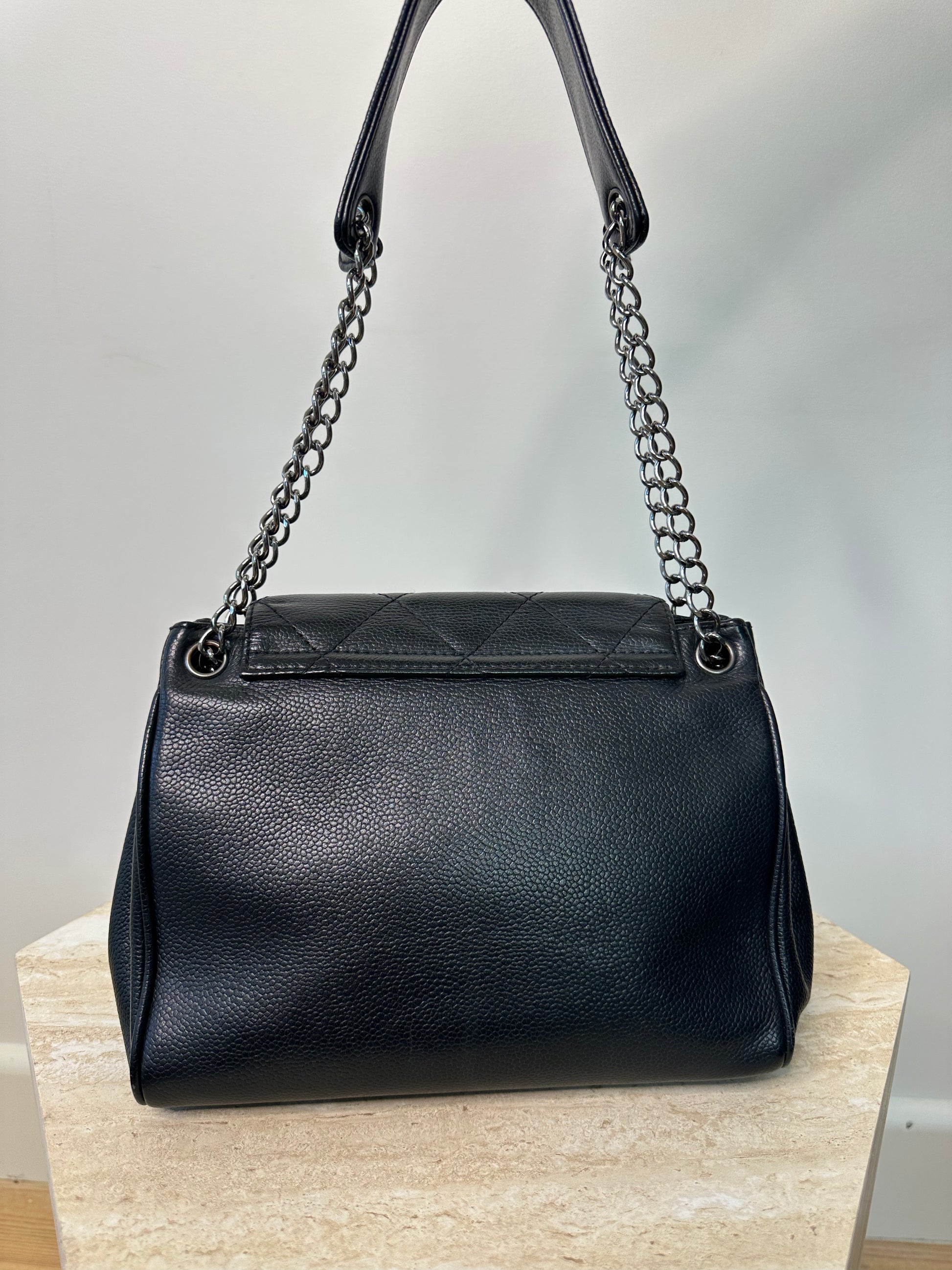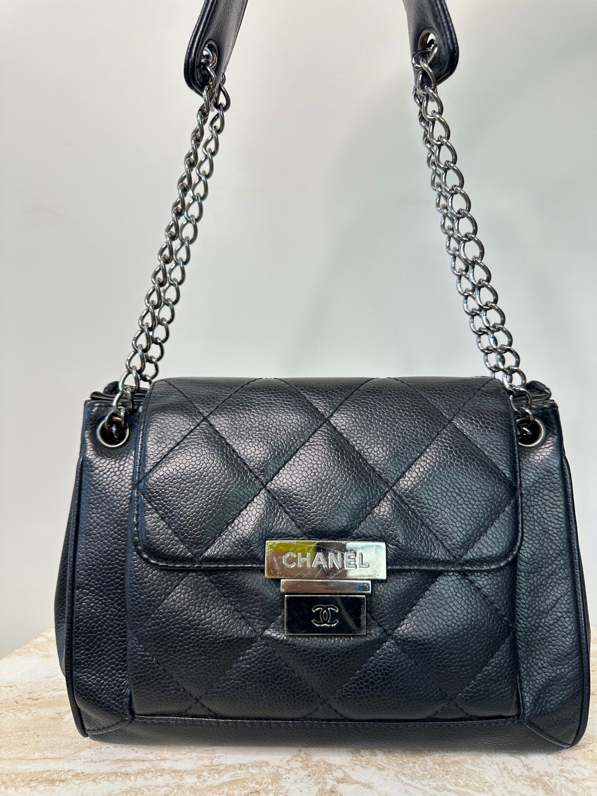Vintage Flap Bag. Featuring Chanel Pushlock, Gunmetal Grey Tone Hardware. Chain Strap With Leather Shoulder Pad.